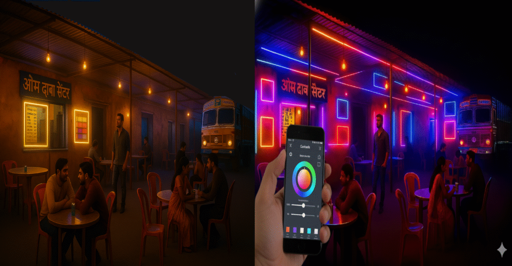 We make sound-reactive, app-controlled, colour-changing LED lighting systems that transform ordinary spaces into vibrant, living experiences — without rebuilding anything. Our lights respond to music in real time, shift moods on command, and bring energy to every kind of space — from rooftop cafés and dance studios to banquet halls, hotels, homes, and religious venues.